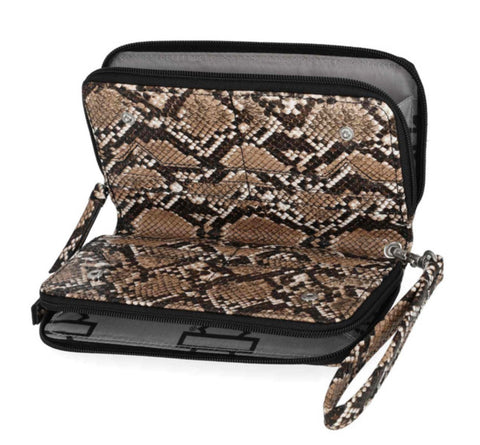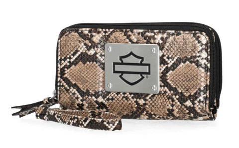 Harley-Davidson® Women's Python Zip Around Wristlet, Brown MWW061/01. Crafted for both style and security, this wristlet features RFID protection. Printed python PU. Interior front slip pockets. Interior credit card slots. Detachable wristlet strap. Size: 7.5" x 3.5".