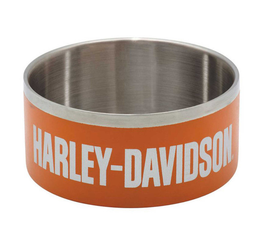 Harley-Davidson® Double-wall, vacuum insulated stainless steel bowl with orange finish and Harley-Davidson® logo. Non-slip silicone base protects floors and helps keep bowl in place. Easy to clean 304 stainless steel is perfect for food or water. Size Small/Medium. Dimensions: 3.25" H x 7" diameter / 8 x 18 cm