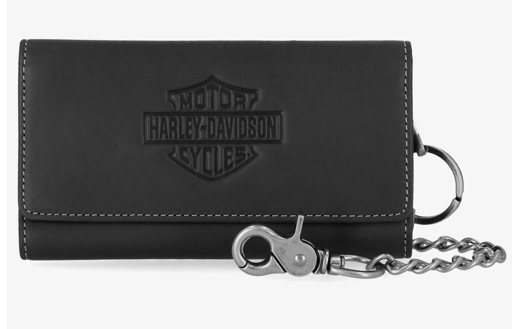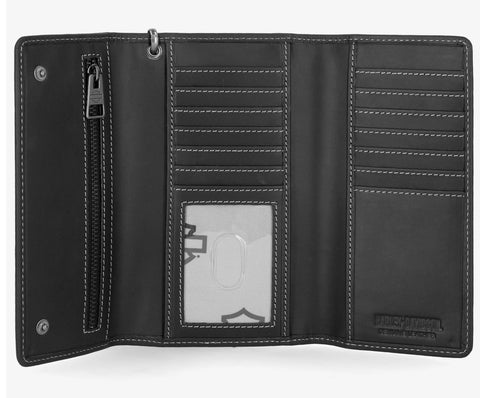 Crafted in genuine, smooth leather, this distinctive traditional B&S trucker chain encompasses all things Harley! Featuring an interior zipper pocket, credit card storage slots, and a chunky detachable chain for the adventure-seeker!