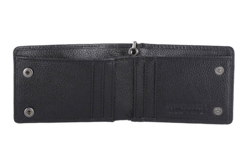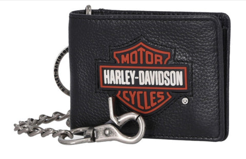 Harley-Davidson® Men's Bar & Shield Patch Bi-fold Leather Wallet - Black MWM096/08. RFID protection. Genuine Leather. Rubber patch logo. Snap closure. Interior credit card slots. Billfold pocket. Exterior ID window. Detachable chain. Size: 4” x 3”.