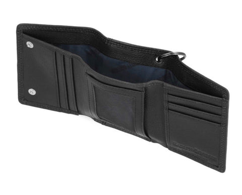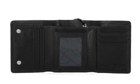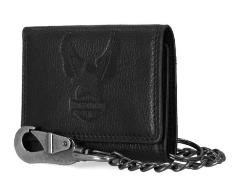 Harley-Davidson® Men's Eagle Tri-Fold Snap Chain Wallet - Black, MWM040/08. Made of high-quality Genuine leather. The best materials make up the long-lasting wallets. Features a direct heat embossed logo. Heavy-duty detachable matte gunmetal finish biker chain. Interior features: 6 credit card slots, ID window and cash slot. RFID Protection, blocks hackers from reading your information. Size: 4.25" x 3.5".