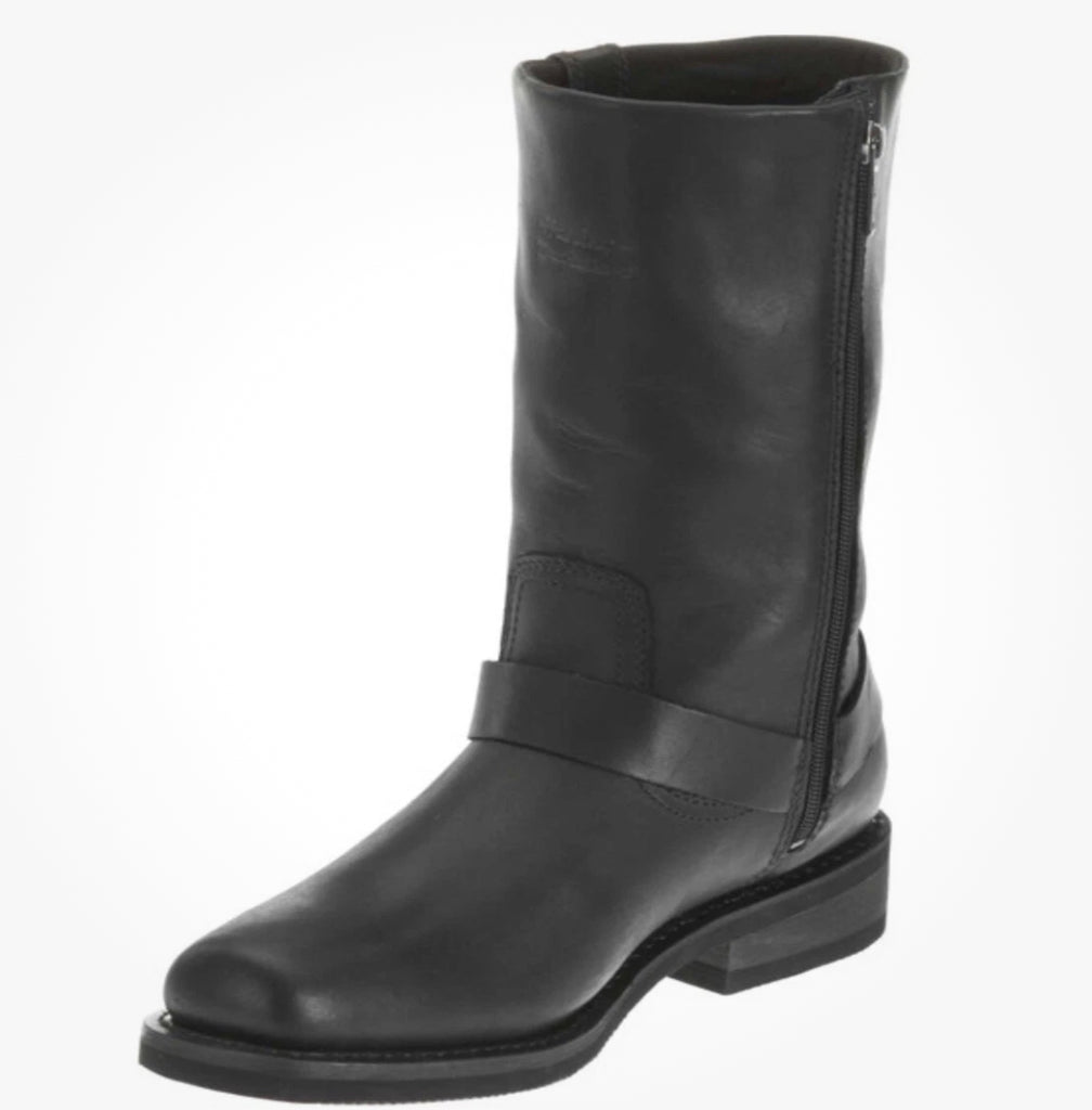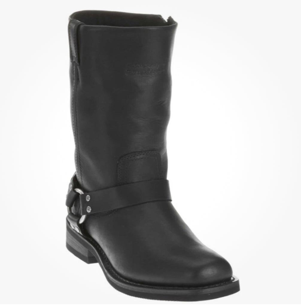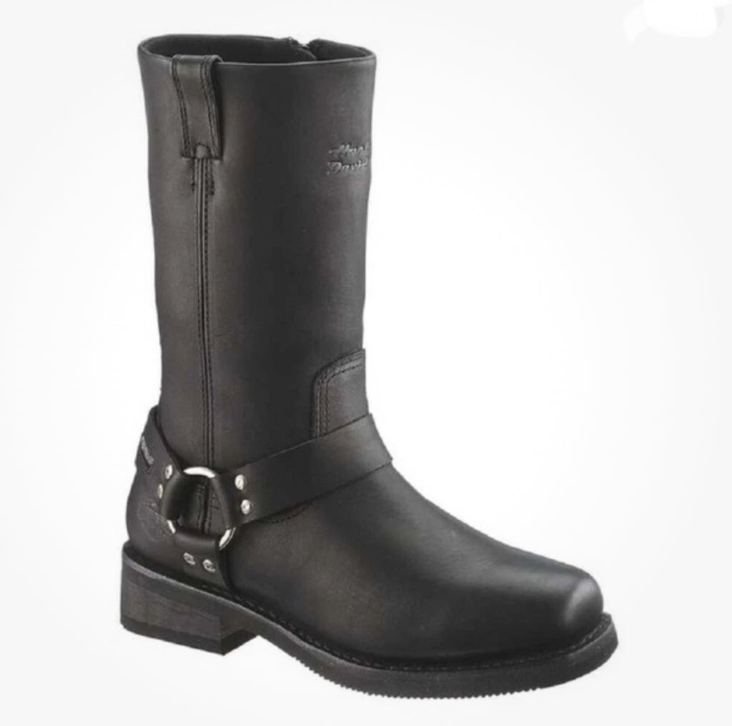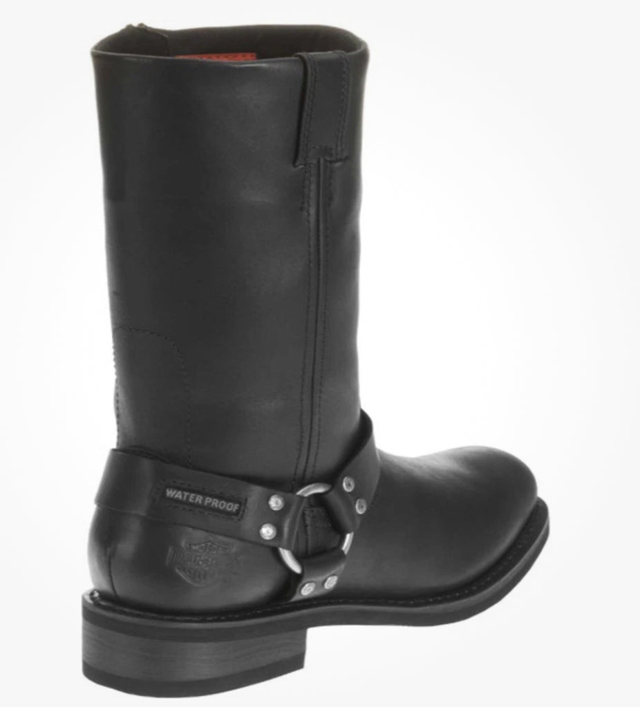 Looking for that one classic pair of motorcycle Riding Appropriate harness boots? One that is waterproof? How about a pair you can actually wear riding? You've found the Harley-Davidson® Hustin. Harley-Davidson® Men's Riding Appropriate waterproof black leather motorcycle harness boots. Classic styling with a front and back cross-strap and attached O-ring. Uppers made from full grain leather with an oil-resistant rubber outsole. The boot features a comfortable full-length soft cushioned lining affording hours of fatigue-free wear. Shaft height: 11", Heel height: 1.5". The boot's sole, insole and upper are bound using resoleable Goodyear® Welt construction processes, adding years of use with proper care. Manufacturer Part Number D95353.