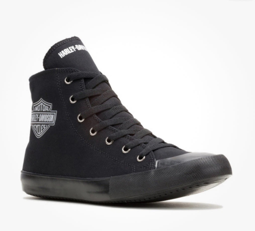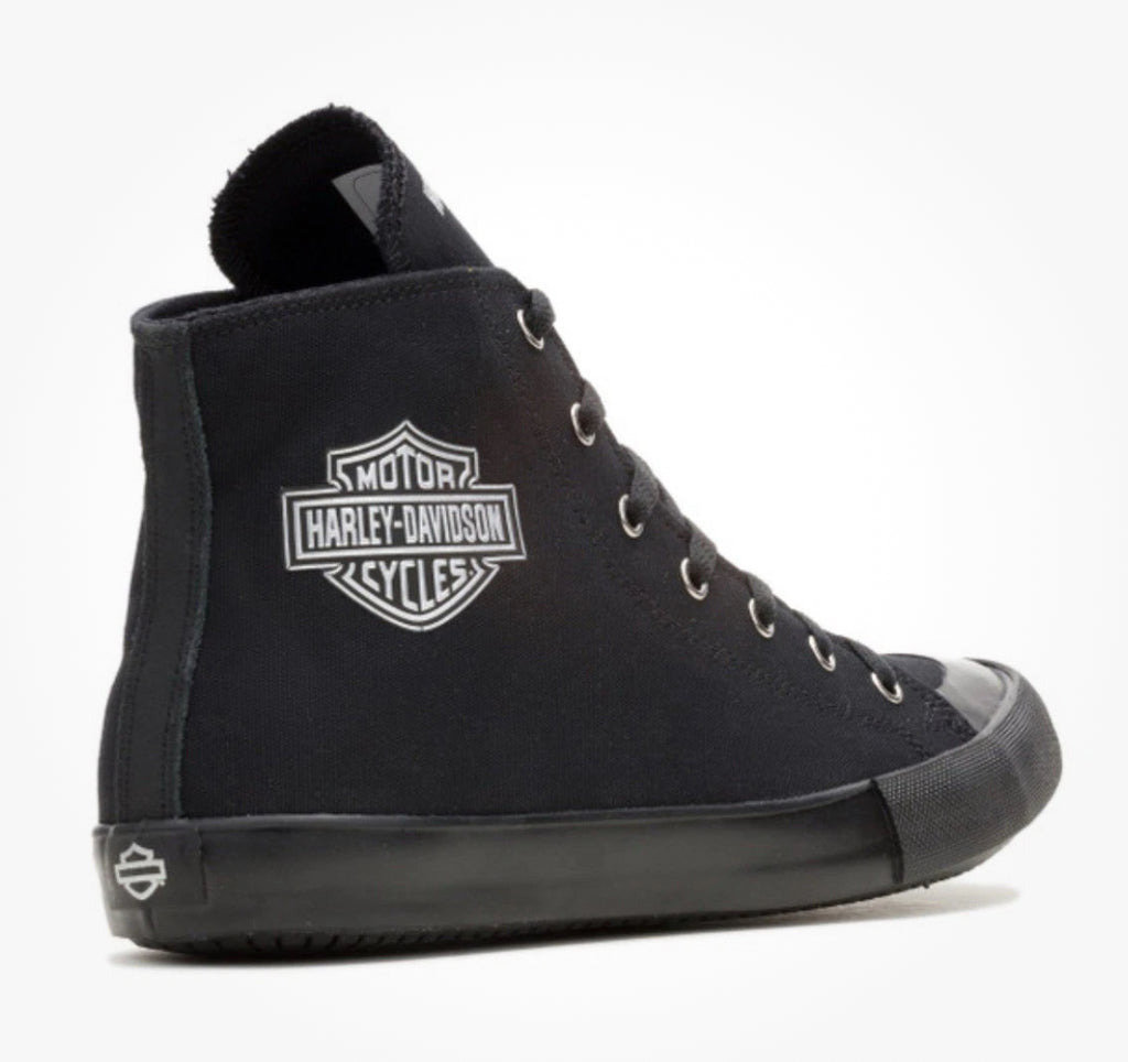 Harley-Davidson® Men's Nathan Black High-Top Canvas Sneakers, Black-D93810. This Nathan is a men's high-top sneaker with starkly white Harley-Davidson® logos. Made with durable canvas uppers and rubber outsoles make these puppies street-ready from the get-go. These shoes will go the distance, on-or-off the court or course - no matter the activity the H-D® edge will be with you. These sneakers are traditional in styling, but cutting edge in performance. With a full-length textile lining, your feet are comfortable with each step or jump. The stark white logos appear on the tongue, and on the outside face of the shaft. The sneaker’s sole, insole and upper are bound using vulcanized processes, a proven technology that binds the upper, midsole, and sole components making for a sturdy and durable sneaker. The end result? These sneakers will last for years. Uptown, downtown, at work or play, they will carry you in-style and comfort. Shaft height: 4.25", Heel height: 1". Sizes US: M 7-12, 13. Manufacturer Part Number, Black-D93810. Wolverine® and Harley-Davidson® have a long tradition of bringing original and functional footwear to our motorcycle enthusiasts. Loyal. Tough. Fearless. Our Footwear embodies the spirit of the open road, as well as the men and women who proudly wear the name. With a growing global presence, Harley-Davidson® Footwear markets functional riding and fashion footwear to anyone who seeks quality and values the Harley-Davidson® brand. Whether it's performance or fashion, we have what you need. Officially Licensed Harley-Davidson® Product by Wolverine®. These sneakers are not recommended for wear while riding a motorcycle.