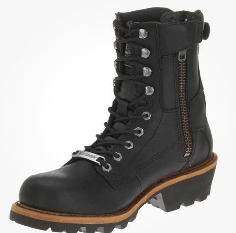 Harley-Davidson® Men's Riding Appropriate* Tyson black leather Logger lace-up motorcycle boots. Designed with metal reinforced eyelets and four open-backed lace hooks for fast and secure lacing at the top. Metal Harley® Bar & Shield Logo badging on sides. 3M™ reflective materials helps to be seen at dawn, dusk or night in all weather conditions. Uppers made from the best full grain leather available. Designed with a removable full-length soft cushioned lining, affording hours of care-free wear. Shaft height: 7.5", Heel height: 2". Features industry's best YKK® locking inside zippers with Velcro closures for ease of putting on and taking off. Vibram® rubber is used for the logger styled outsoles for optimum traction, comfort and performance. The boot's sole, insole and upper are bound using resoleable Goodyear® Welt construction processes, the most labor intensive and durable construction method available. Manufacturer Part Number D95188.