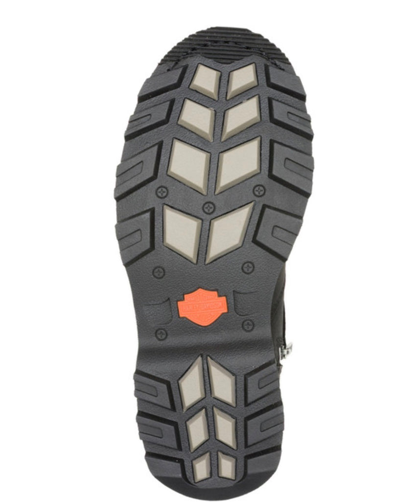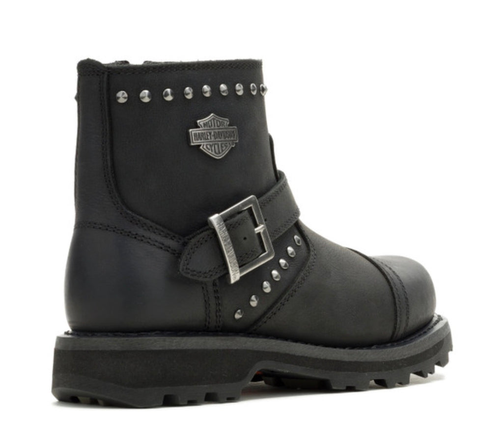 Harley-Davidson® Riding Appropriate* Women's Oakleigh Buckle Ride 6-Inch Black Motorcycle Boots, D87322. Capture the essence of freedom and adventure with these waterproof full-grain leather boots. With a breathable Hydro-Guard® membrane, your feet stay dry and comfy whether you’re on the road, at work, or just strolling around town. With PORON® ankle protection, you have it all. The toe is rounded, and a front crossing strap and logo buckle assures a perfect fit. Donning is easy with locking inside full-length zippers. The shaft height is a modest 6-inches, providing a total lift of 7.25-inches. Stainless-steel rivets adorn the top of the cuff and add depth to the vamp. A classic Bar & Shield® logo badge adds a final touch to the upper shaft. The street-side rubber outsole has grippy tread elements, and a Harley® orange Bar & Shield® logo is imbedded at the instep. The boot's sole, insole and upper are bound using Goodyear™ Welt construction processes, a labor intensive and durable construction method. Pair with jeans on the bike. Off the bike, go uptown with leggings, or skirts for a modern look. Total height: 7.25", Shaft height: 6", Heel height: 1.25". Sizes US: M 5-10, 11. Manufacturer Part Number, D87322. Wolverine® and Harley-Davidson® have a long tradition of bringing original and functional footwear to our motorcycle enthusiasts. Loyal. Tough. Fearless. Our Footwear embodies the spirit of the open road, as well as the men and women who proudly wear the name. With a growing global presence, Harley-Davidson® Footwear markets functional riding and fashion footwear to anyone who seeks quality and values the Harley-Davidson® brand. Whether it's performance or fashion, we have what you need. Officially Licensed Harley-Davidson® Product by Wolverine®. *Riding Appropriate – Abrasion, slip, and oil-resistant boots, ideal for riding motorcycles.