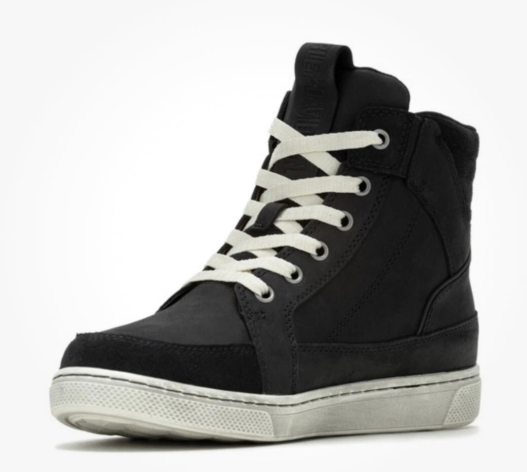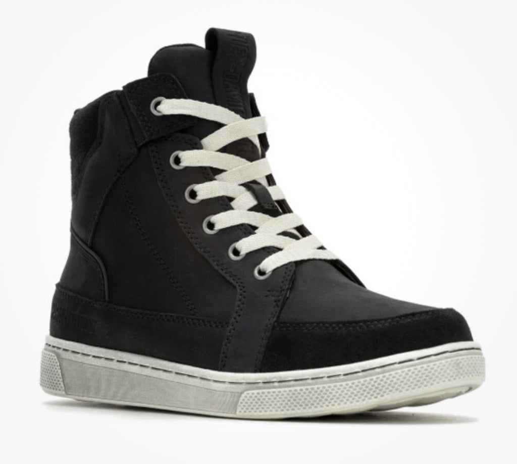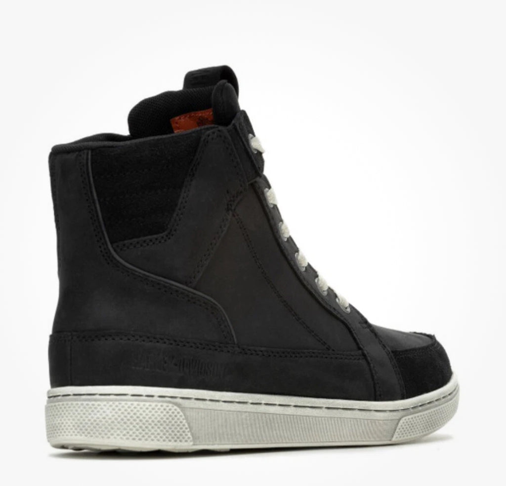 Harley-Davidson® Women's Riding Appropriate* Arbury 4.5-Inch Black Waterproof Motorcycle Sneaker Boots, Black-D60003. Kick start your ride with The Arbury full-grain leather sneaker with suede accents. Featuring Poron® ankle protection, 3M™ reflective piping for added visibility, and waterproof protection, these boots are road and fashion ready. Built on slip and oil resistant rubber outsoles, these boots will keep you safe while giving you the urban style you crave. White laces match the outsoles, contrasting nicely with the leather uppers. The tongue is padded and a logo pull-on strap aids in donning. A debossed logo is also found on the outside face of the heel’s counter. The street-side sole has a classic Harley® orange Bar & Shield® logo. The shoes are built for the bike and for whatever follows after the kick-stand goes down. Total height: 5.5", Shaft height: 4.5", Heel height: 1". Sizes US: M 5-10, 11. Manufacturer Part Number, Black-D60003. Wolverine® and Harley-Davidson® have a long tradition of bringing original and functional footwear to our Motorcycle enthusiasts. Loyal. Tough. Fearless. Our Footwear embodies the spirit of the open road, as well as the men and women who proudly wear the name. With a growing global presence, Harley-Davidson® Footwear markets functional riding and Motorcycle footwear to anyone who seeks quality and values the Harley-Davidson® brand. Whether it's performance or Motorcycle, we have what you need. Officially Licensed Harley-Davidson® Product by Wolverine®. *Riding Appropriate – Abrasion, slip, and oil-resistant boots, ideal for riding motorcycles.
