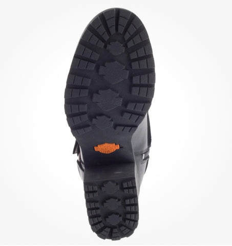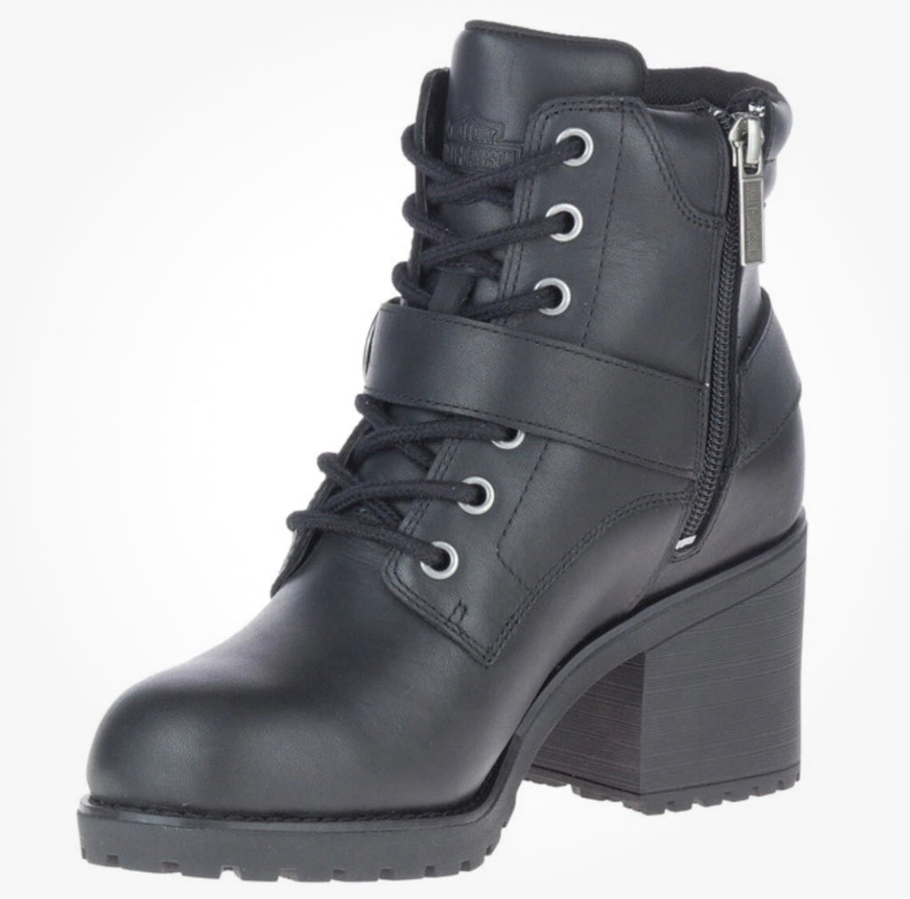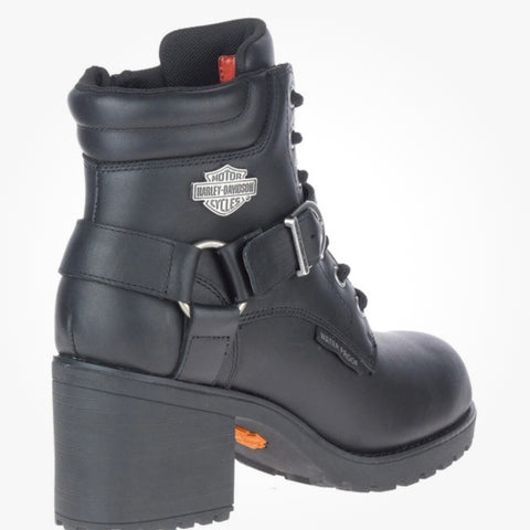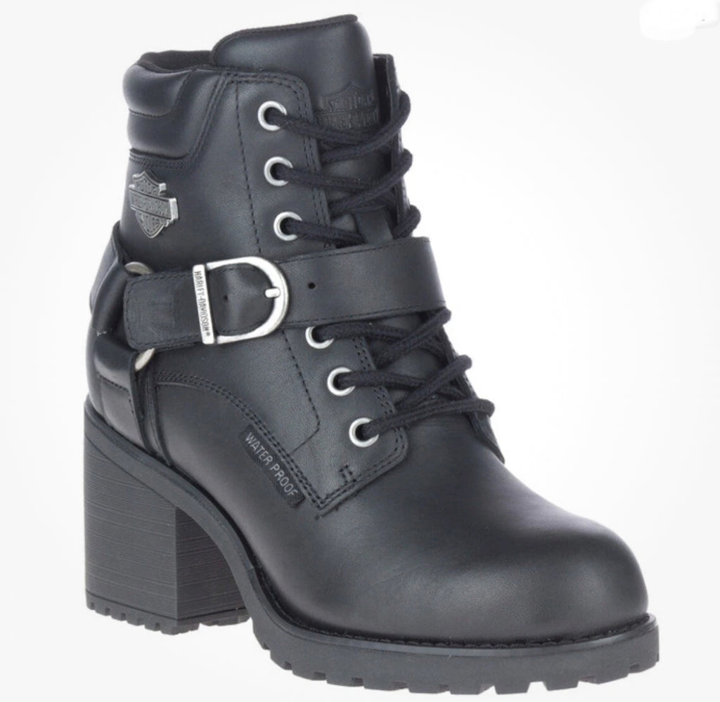 Harley-Davidson® Women’s Howell Riding Appropriate* Black 5-Inch Lace-Up Motorcycle Boots, D84664. On and off the bike, these urban street-savvy leather lace-up boots are styled for all-day wear. Featuring 2.75-inch block heels combined with harness styling, they hit the mark for any environment, even in the rain – they are waterproof, too. With round toe chic styling, the boots feature a front crossing strap with an adjustable logo buckle. A metal Bar & Shield® is attached just above a harness styled O-Ring. Another logo is debossed at the top of the cushioned tongue. A fabric waterproof badge is sewn on the side of the vamp. Seven metal eyelets with cord lacing finishes the tie-off. A cushion collar makes all-day wear comfortable. The uppers are made with breathable waterproof full-grain leather. The full-length lining has a breathable Hydro-Guard™ waterproof membrane. These boots are rain and even puddle proof. The street side rubber soles have a classic orange Bar & Shield® logo at the instep. The boot's sole, insole and upper are bound using cement construction processes, a time honored and durable method that allows for a flexible and easy stride. Total height: 7.25", Shaft height: 4.5", Heel height: 2.75". Sizes US: M 5-10, 11. Manufacturer Part Number, Black-D84664. Wolverine® and Harley-Davidson® have a long tradition of bringing original and functional footwear to our motorcycle enthusiasts. Loyal. Tough. Fearless. Our Footwear embodies the spirit of the open road, as well as the men and women who proudly wear the name. With a growing global presence, Harley-Davidson® Footwear markets functional riding and fashion footwear to anyone who seeks quality and values the Harley-Davidson® brand. Whether it's performance or fashion, we have what you need. Officially Licensed Harley-Davidson® Product by Wolverine®. *Riding Appropriate – Abrasion, slip, and oil-resistant boots, ideal for riding motorcycles.