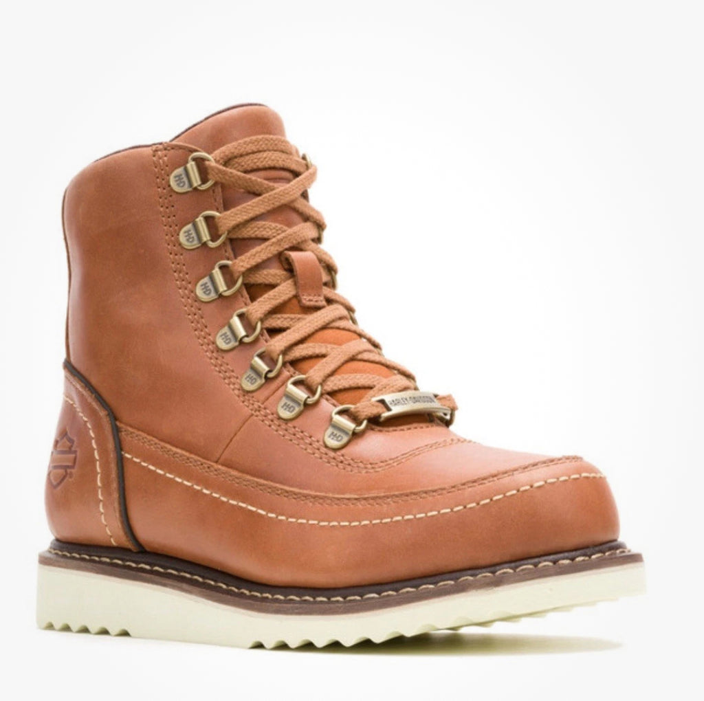 Harley-Davidson® Women's Riding Appropriate* Juno Lace Ride 5.25-Inch Black or Brown Motorcycle Boots, Brown-D87316. Elevate your ride with the Women’s Juno Lace Riding Wedge Boot. Featuring a sleek design with practical features like D30® ankle protection and 3M™ reflective material, all mounted on a comfortable wedge outsole – form and function at its best! Made with premium full-grain leather uppers and a full-length mesh lining for total comfort, you’ll be seen in low light conditions with the 3M™ reflective material. Step-in and zip-up with the YKK® locking inside zippers and you are on your way knowing D30® ankle protection is going with you. A rounded toe leads up to color coordinated laces with logo D-Ring eyelets. A metal logo badge sits on the bottom lace. A debossed Bar & Shield® silhouette logo appears on the heel’s counter. Once your tie-off is completed, on your first step you’ll immediately feel the comfort of the padded tongue. The lightweight color-matched polyurethane outsoles make for a comfortable stride, and each step is secured with grippy tread elements on the street-side. The boot's sole, insole and upper are bound using Goodyear® Welt construction, completing the boot with trusted durability. The Juno Lace Ride will get you through anything, on or off the bike. Total height: 6.25", Shaft height: 5.25", Heel height: 1". Sizes US: M 5-10, 11. Manufacturer Part Number, Brown-D87316. Wolverine® and Harley-Davidson® have a long tradition of bringing original and functional footwear to our Motorcycle enthusiasts. Loyal. Tough. Fearless. Our Footwear embodies the spirit of the open road, as well as the men and women who proudly wear the name. With a growing global presence, Harley-Davidson® Footwear markets functional riding and Motorcycle footwear to anyone who seeks quality and values the Harley-Davidson® brand. Whether it's performance or Motorcycle, we have what you need. Officially Licensed Harley-Davidson® Product by Wolverine®. *Riding Appropriate – Abrasion, slip, and oil-resistant boots, ideal for riding motorcycles.