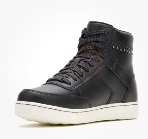 Harley-Davidson® Women's Grady 5.25-Inch Waterproof Black Sneaker Boots, Black-D84812. This boot carries the heart and soul of the popular Grady line, which dares to be different. Studded for attitude and crafted for comfort, these edgy boots meet any demand for whatever road you take in your daily journey, whether it’s walking, riding, strolling, or dancing. Made with Waterproof full-grain leather uppers, the lining contains a breathable Hydro-Guard™ waterproof membrane, keeping your feet dry in all weather conditions. The Grady was designed to bring a new modern aesthetic to the Harley-Davidson® footwear line. The badging is subtle, with color conforming laces, and a color matched logo badge on the bottom lace. Metal studs wrap around the upper shaft and also decorate the outside face of the boot. The tongue and the upper cuff are padded for extra comfort. A Bar & Shield® logo is embroidered on the boots heel. The rubber outsoles are a beautiful white color, and another color matched logo is imbedded on the street-side instep. The boot's sole, insole and upper are bound using cement construction processes, a time honored and durable method that allows for a flexible and easy stride. A Bar & Shield® logo can also be found on the street-side, at the instep. Uptown, downtown, at work or play, or on a bike, these boots will get you there in style and comfort. Shaft height: 5.25", Heel height: 1". Sizes US: M 5-10, 11. Manufacturer Part Number, Black-D84812. Wolverine® and Harley-Davidson® have a long tradition of bringing original and functional footwear to our motorcycle enthusiasts. Loyal. Tough. Fearless. Our Footwear embodies the spirit of the open road, as well as the men and women who proudly wear the name. With a growing global presence, Harley-Davidson® Footwear markets functional riding and fashion footwear to anyone who seeks quality and values the Harley-Davidson® brand. Whether it's performance or fashion, we have what you need. Officially Licensed Harley-Davidson® Product by Wolverine®.