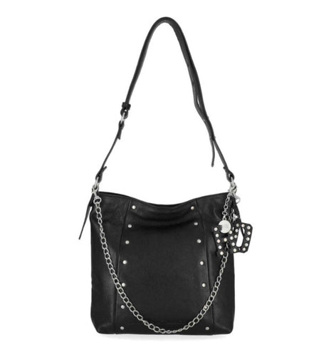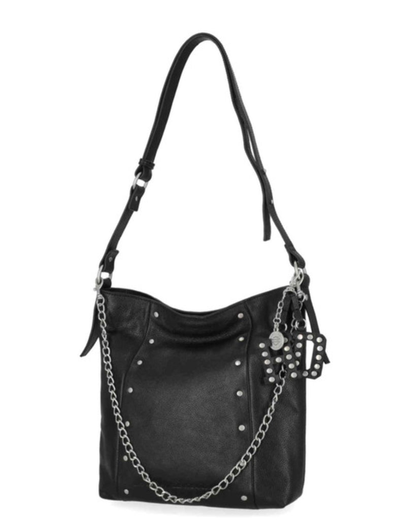 Harley-Davidson® Women's Shoulder Purse, Black MHW170/08. Brushed nickel finish. Genuine leather. Magnetic closure. Detachable HD leather fob and H-D charm. Interior front slip pocket. Interior back zipper pocket. Adjustable shoulder strap. Size: 10" x 11" x 2.5".