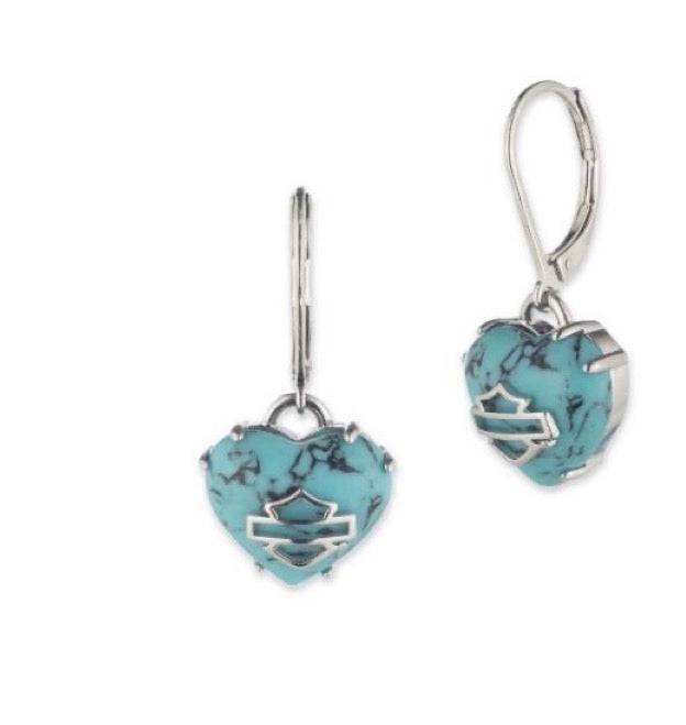Harley-Davidson® Women's Turquoise Bar & Shield Heart Drop Earrings, 34G00252. Add a touch of Harley® attitude to your look with these stunning heart-shaped dangle earrings. Each earring features a stunning turquoise heart shaped charm with a Bar & Shield logo on a sleek heart design. Crafted from Stainless Steel with a sleek finish, this piece is built to stand the test of time, ride after ride. A perfect accessory for any rider or collector, these studs bring classic Harley-Davidson® spirit to any outfit.