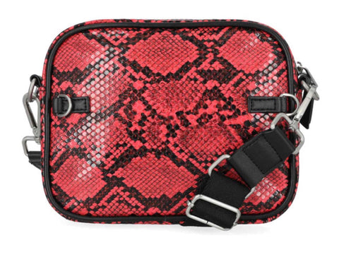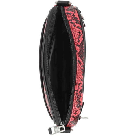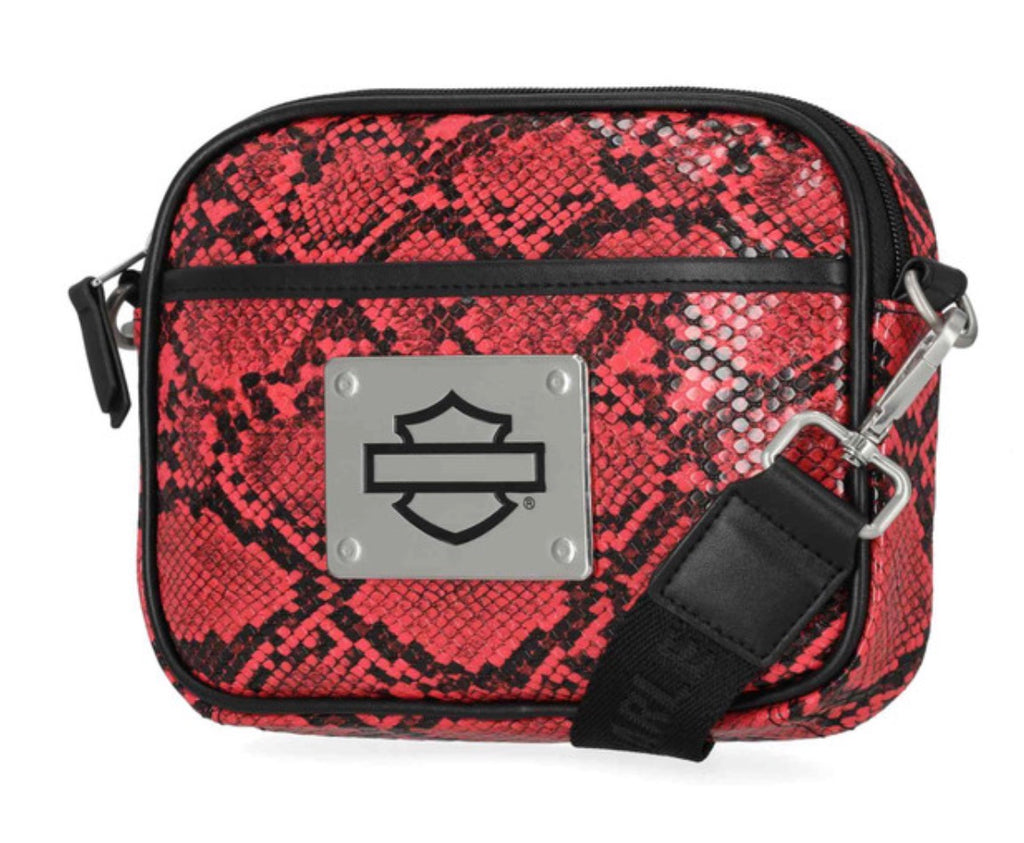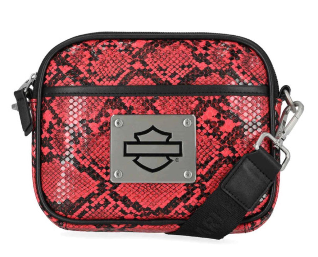 Harley-Davidson® Women's Crossbody Belt Bag, Pink MHW183/16. Brushed nickel finish. Printed python PU. Convertible to hip bag. Top zipper closure. Exterior front slip pocket. Interior front slip pocket and back zipper pocket. Detachable and adjustable shoulder strap. Size: 7.5" x 6" x 1.25".