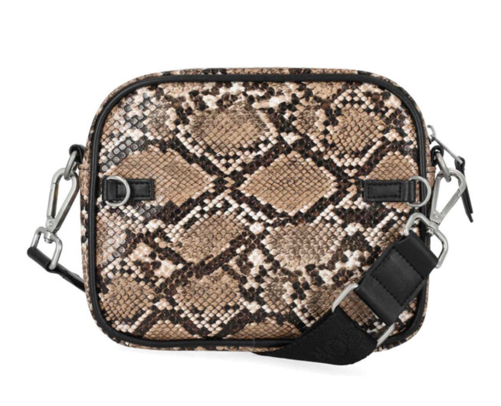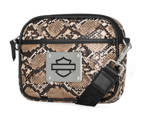 Harley-Davidson® Women's Crossbody Belt Bag, Brown MHW183/01. Brushed nickel finish. Printed python PU. Convertible to hip bag. Top zipper closure. Exterior front slip pocket. Interior front slip pocket and back zipper pocket. Detachable and adjustable shoulder strap. Size: 7.5" x 6" x 1.25".