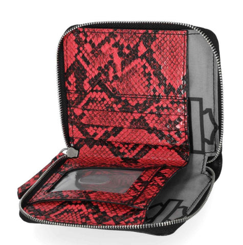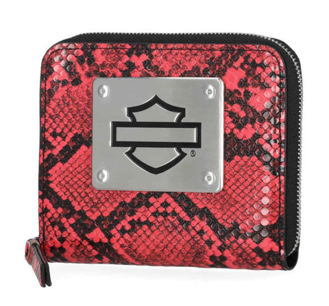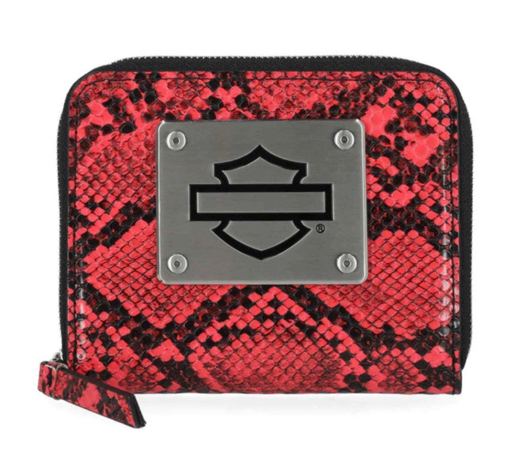 Harley-Davidson® Women's Python Zip Around Wallet, Pink MWW062/01. Crafted for both style and security, this wallet features RFID protection. Printed python PU. Interior credit card slots, zipper pocket and slip pocket. Size: 5" x 4.25".