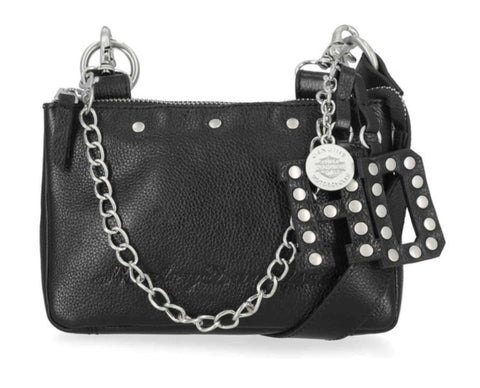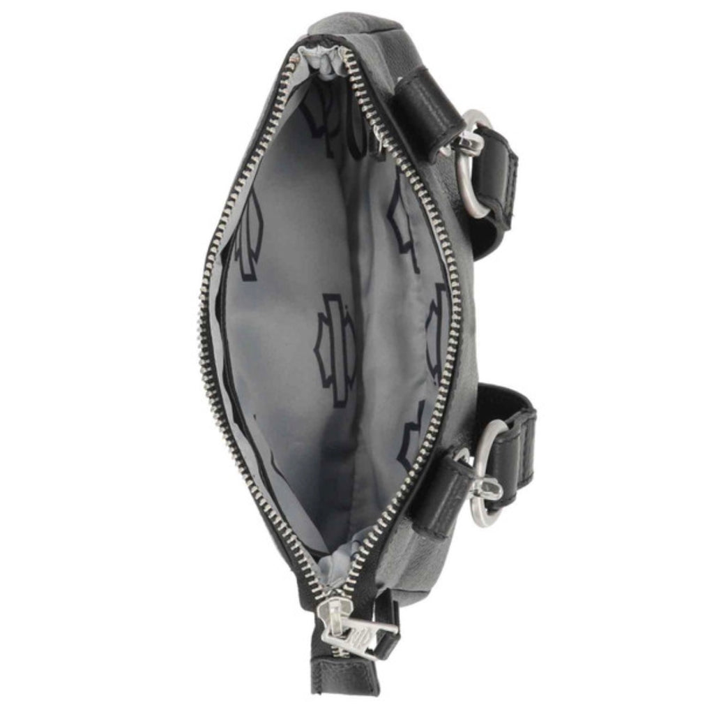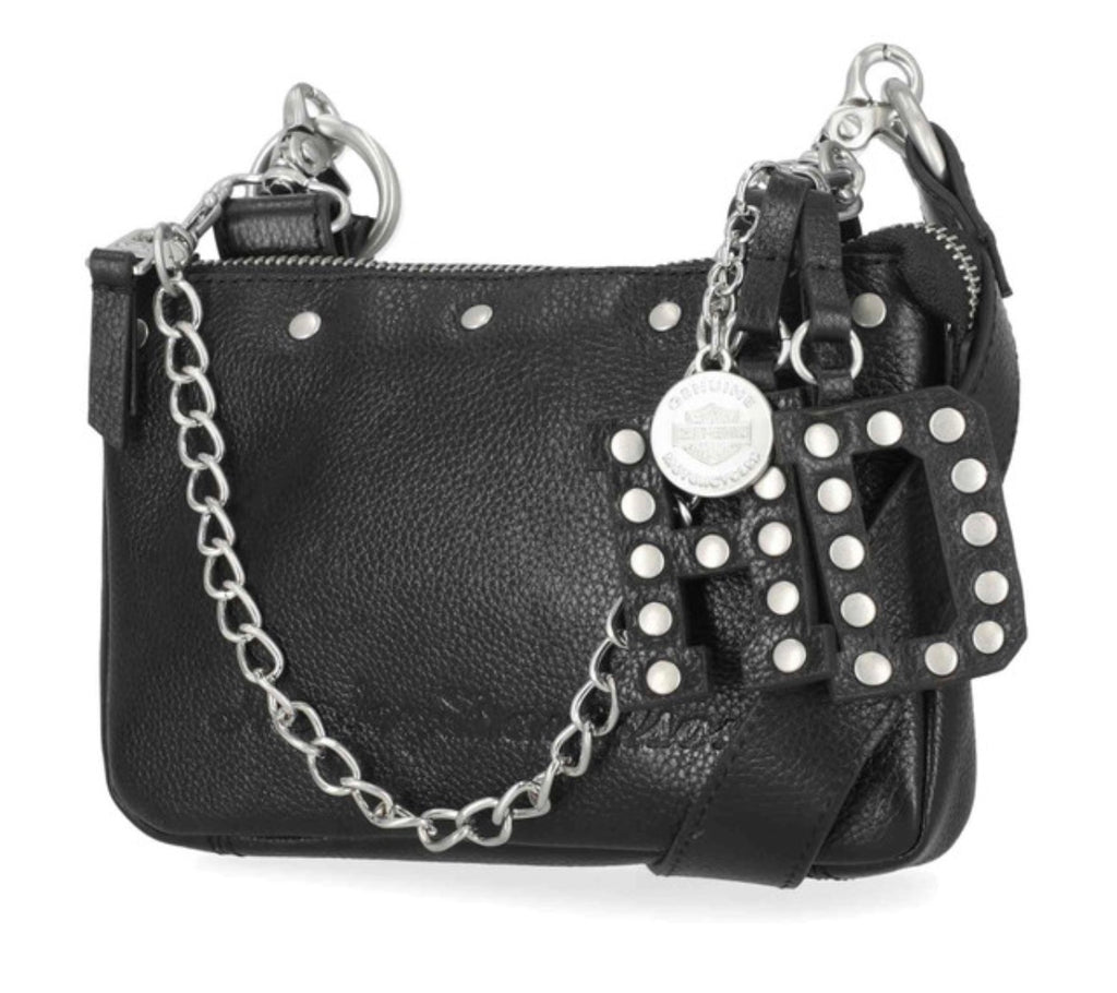 Harley-Davidson® Women's Hip Bag, Black MHW193/08. Brushed nickel finish. Crafted from Genuine leather. Converts to hip bag. Top zip closure. Detachable HD leather fob and H-D charm. Interior front slip pocket and back zipper pocket. Detachable and adjustable shoulder strap. Size: 7.5" x 5" x 1.5".
