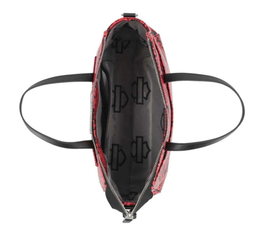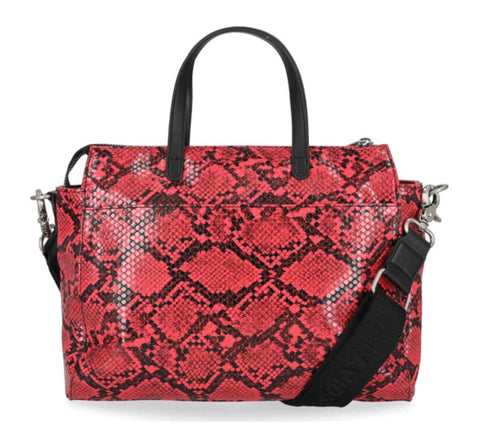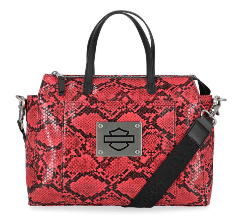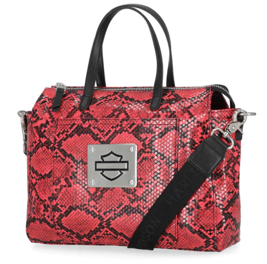 Harley-Davidson® Women's Python Satchel, Pink MHW190/01. Brushed nickel finish. Printed python PU. Top zipper closure. Exterior front slide pocket. Interior front slip pocket. Interior back zipper pocket. Detachable and adjustable shoulder strap. Size: 11" x 8.5" x 3.5".