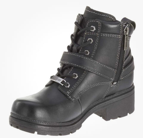 Harley-Davidson® Women's Tegan black leather motorcycle harness styled boots, D84424. Made with the best full-grain leather uppers available, a full-length soft cushioned sock lining, and industry's best YKK® locking inside zippers for ease of putting on and taking off, the Tegan styled boot offers everything you can want in a functional and stylish boot. Designed in the harness boot style, the boots have straps on the front, bottom, and rear attaching to a side O-Ring. There is more. A Harley® logo buckle is on the front strap, along with metal eyelets, a metal Harley® badge on the bottom lace, and a Harley® Bar & Shield logo is on the side of the shaft. Shaft height: 4-inches, Heel height: 1.75-inches. The boots are finished with lightweight outsoles and heels for a carefree stride. The boot's sole, insole and upper are bound using state-of-the-art cement construction processes. Manufacturer Part Number D84424.