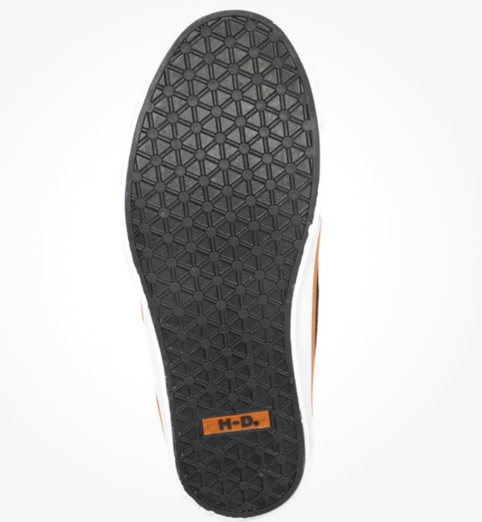 Harley-Davidson® Women's Torland Black Vintage Style Sneakers with Orange Highlights, D83497. Feel comfortable and look iconic with these vintage styled black sneakers with orange highlights. These canvas vulcanized sneakers will take your off-the-bike street cred to the next level. Part of the Vintage Collection of Harley® footwear, these sneakers are made with high quality canvas and vulcanized rubber outsoles. They are up to the task, whether walking, running, or jumping. With orange thread highlights and orange H-D® badging, the heritage is unmistakable. The white outsole beautifully contrasts with the black canvas, and the street-side has a classic H-D® logo on the heel. The boot's outsole is made using vulcanized construction processes, extending the outsole’s durability and flexibility, affording the comfort you desire no matter the activity. Uptown or downtown, these sneakers epitomize style and comfort. Each pair of sneakers comes with a contrasting orange colored second lace. Shaft height: 2", Heel height: 1". Sizes US: M 5-10, 11. Manufacturer Part Number, D83497. Wolverine® and Harley-Davidson® have a long tradition of bringing original and functional footwear to our Fashion enthusiasts. Loyal. Tough. Fearless. Our Footwear embodies the spirit of the open road, as well as the men and women who proudly wear the name. With a growing global presence, Harley-Davidson® Footwear markets functional riding and fashion footwear to anyone who seeks quality and values the Harley-Davidson® brand. Whether it's performance or fashion, we have what you need. Officially Licensed Harley-Davidson® Product by Wolverine®. These sneakers are not recommended for riding on motorcycles.